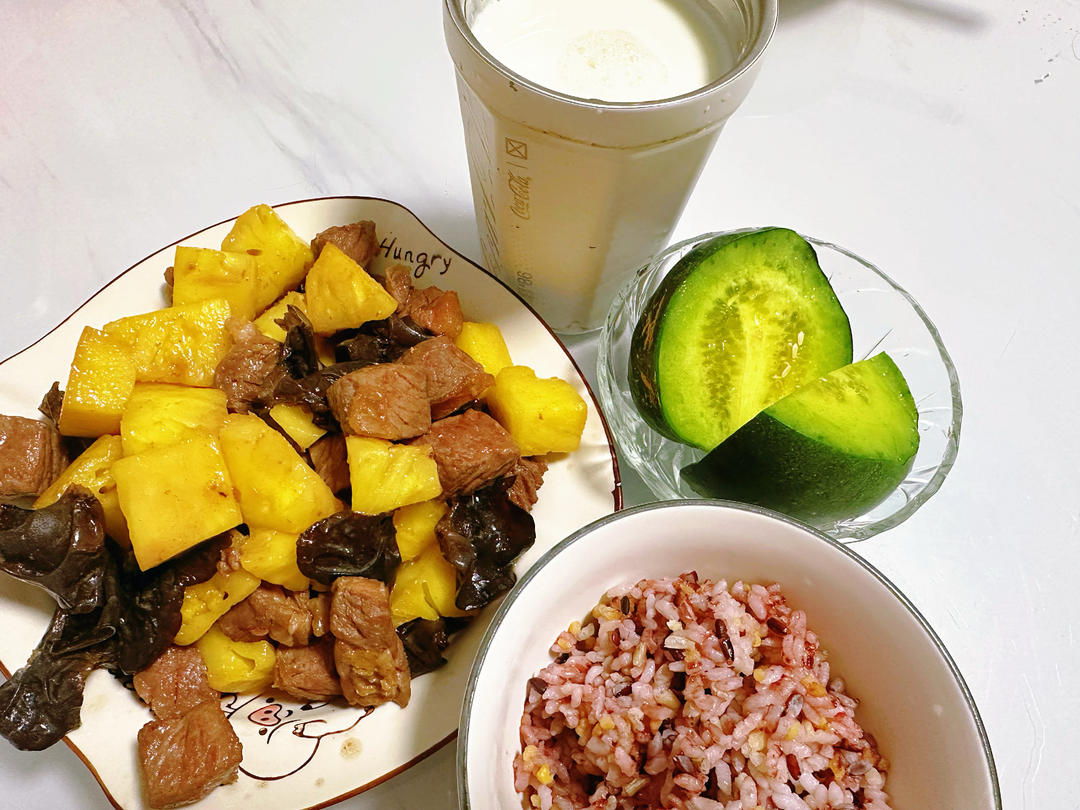 牛肉粒炒菠萝,杂米饭,牛奶,甜瓜