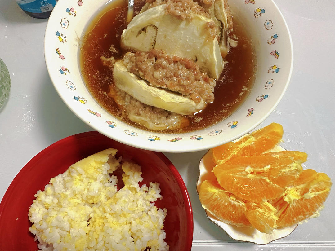 蒸茄夹,两米饭,橙子