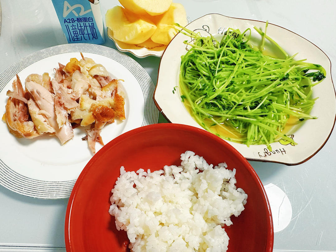 清炒豆苗,鸡肉,白米饭,苹果