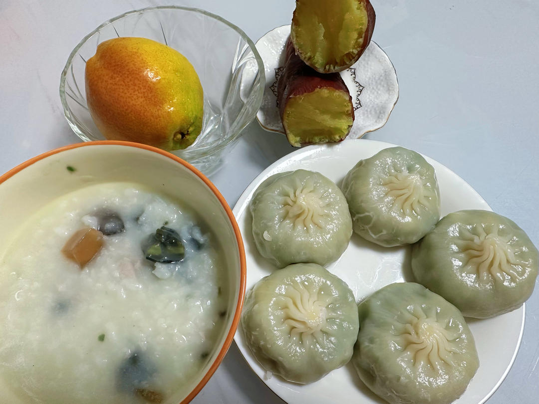 荠菜鸡蛋包,皮蛋瘦肉粥,红薯