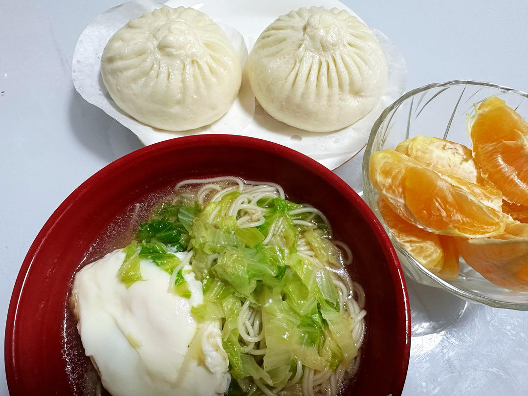 白菜面条汤,猪肉包,橙子