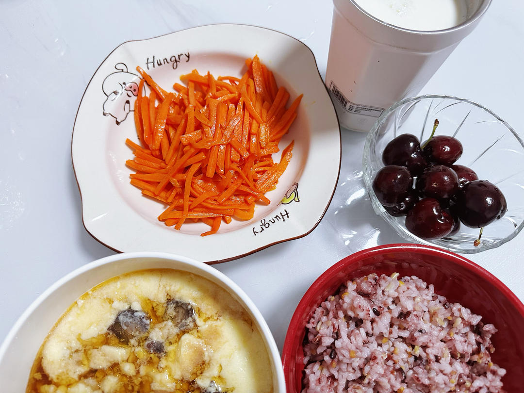 素炒胡萝卜丝,海参鸡蛋羹,杂米饭,牛奶,车厘子