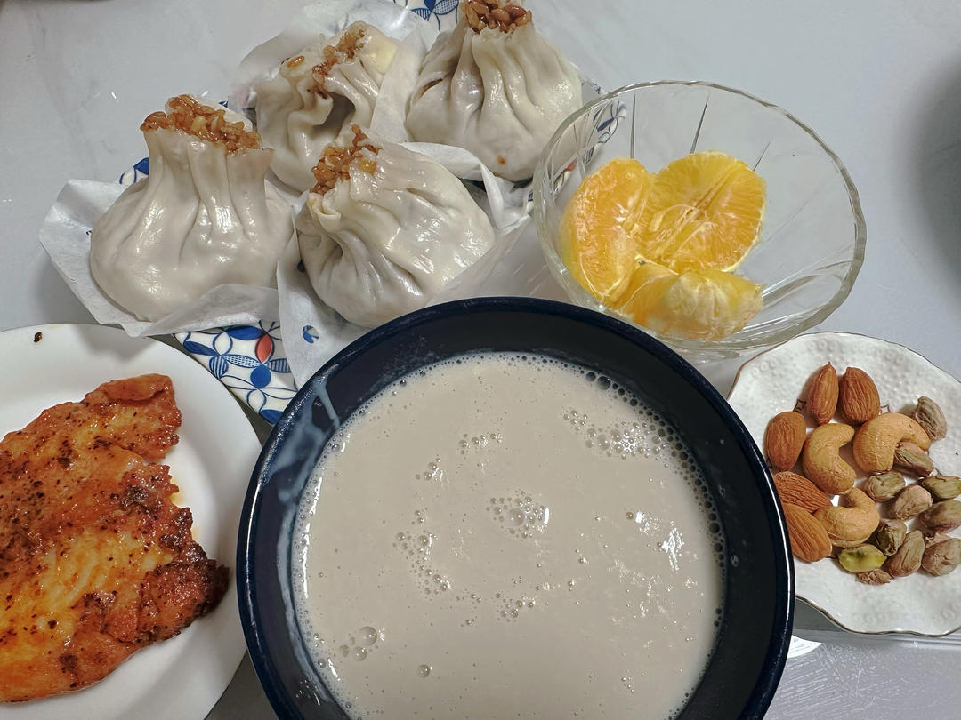 松子烧卖,豆浆,鱼排,橙子