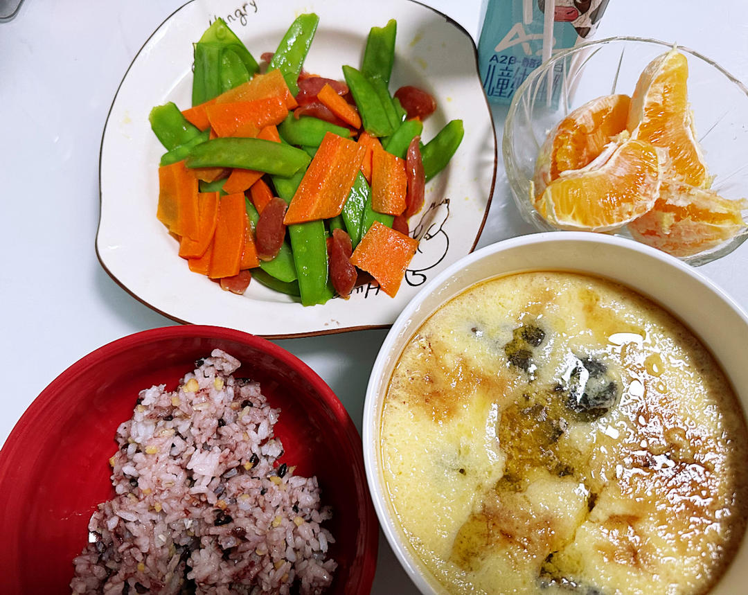 荷兰豆炒腊肠,鸡蛋羹,杂米饭,血橙