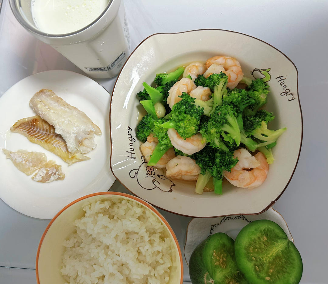西蓝花炒虾仁,煎鱼,米饭,甜瓜