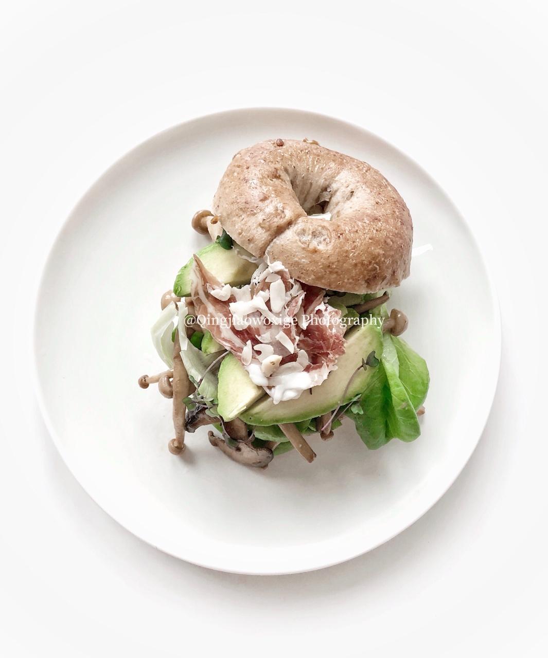 開放式原味貝果:內料分別是醬爆菇+牛油果+生菜葉+煙薰火腿+花生碎。