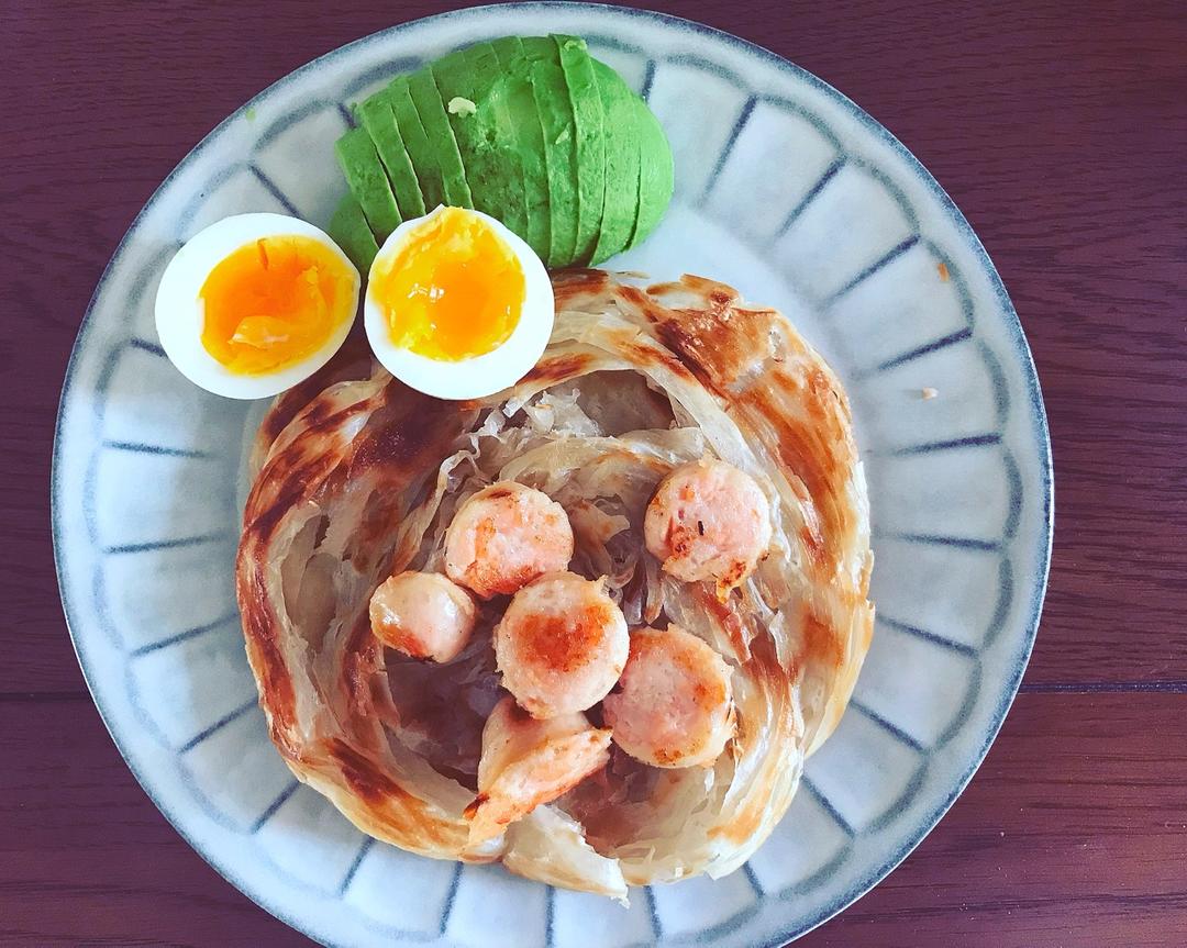 手抓饼、烤肠、溏心蛋、牛油果。