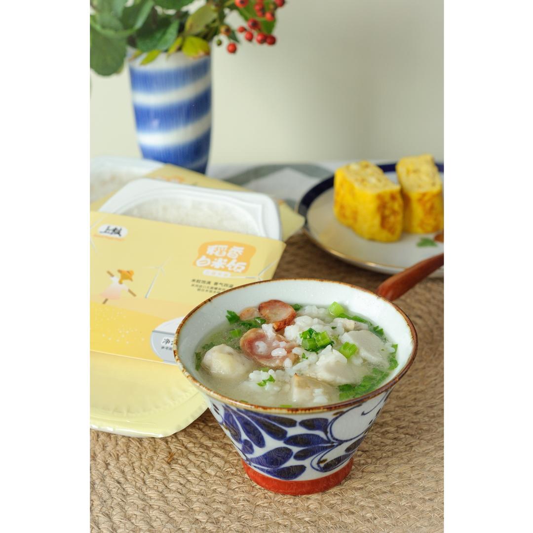 上饭菜泡饭——秋意凉,早餐吃点热乎的最适意了,用上饭香稻方便米饭打底配香肠,芋艿,香芹菜烧一小锅菜泡饭,米粒晶莹弹牙,泡...