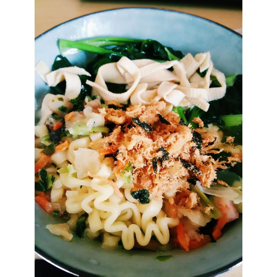 海鲜拉面,食堂打了青菜,加了点肉松,为了味道浓郁,少汤,加酱料之...