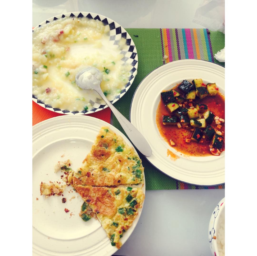 鸡蛋饼,凉拌黄瓜,腊肉土豆泥