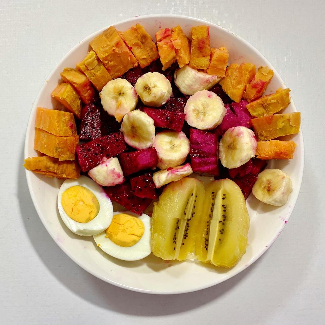 红薯鸡蛋火龙果猕猴桃香蕉沙拉➕红枣燕麦米糊
