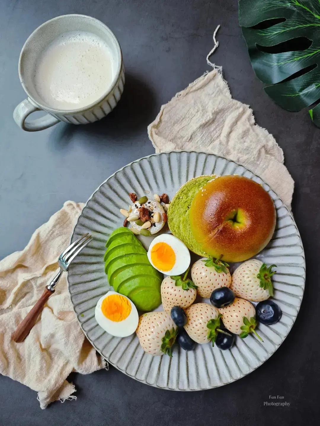 今日份早餐——抹茶贝果+芥末虾球+抹茶椰子水(椰子水200g+抹茶粉3g〈抹茶粉+温水少许搅打成抹茶液,再倒入椰子水中〉...