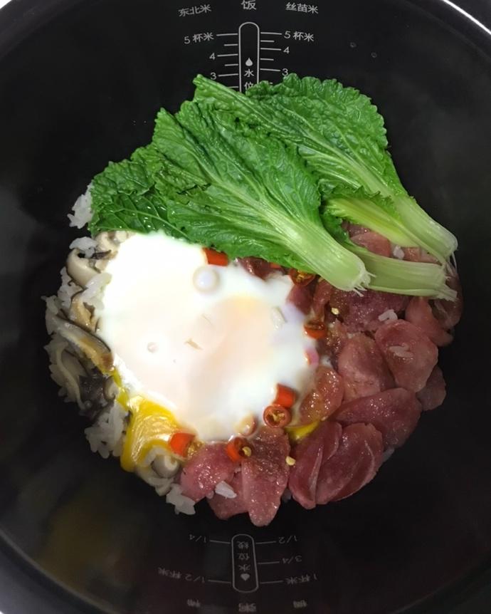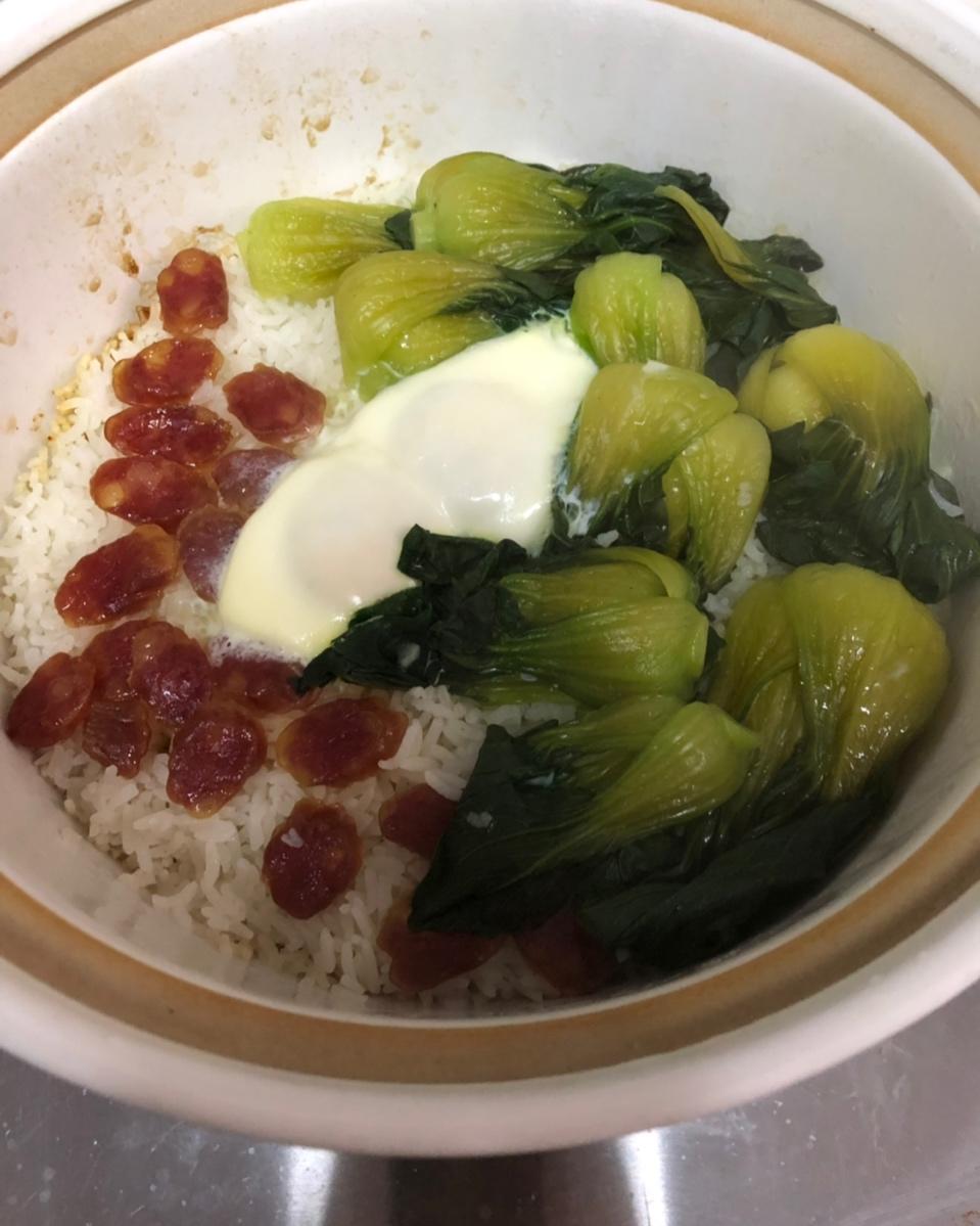 自己水放的多了饭有点软,腊肠其实一根就够了。蛋下次再晚点放,我喜欢吃生点的蛋