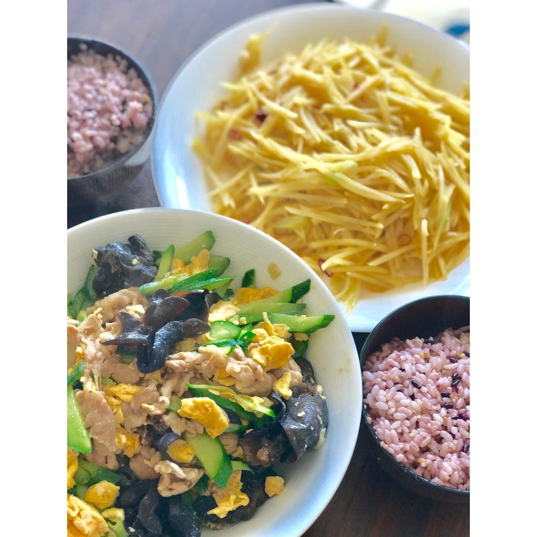 醋溜土豆丝,木须肉,杂谷饭。都是家常。