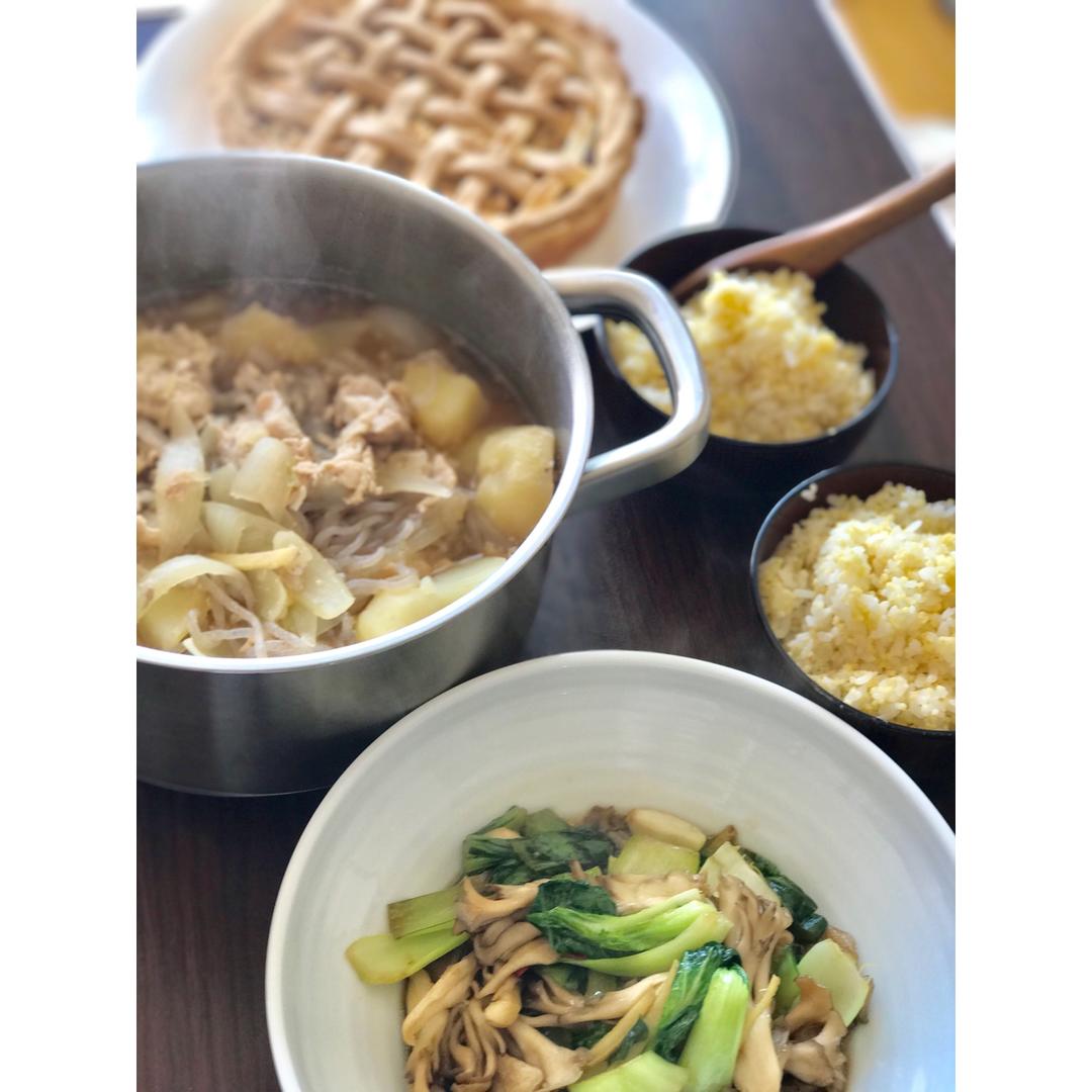 青菜炒蘑菇,日式土豆炖肉,二米饭,苹果派。