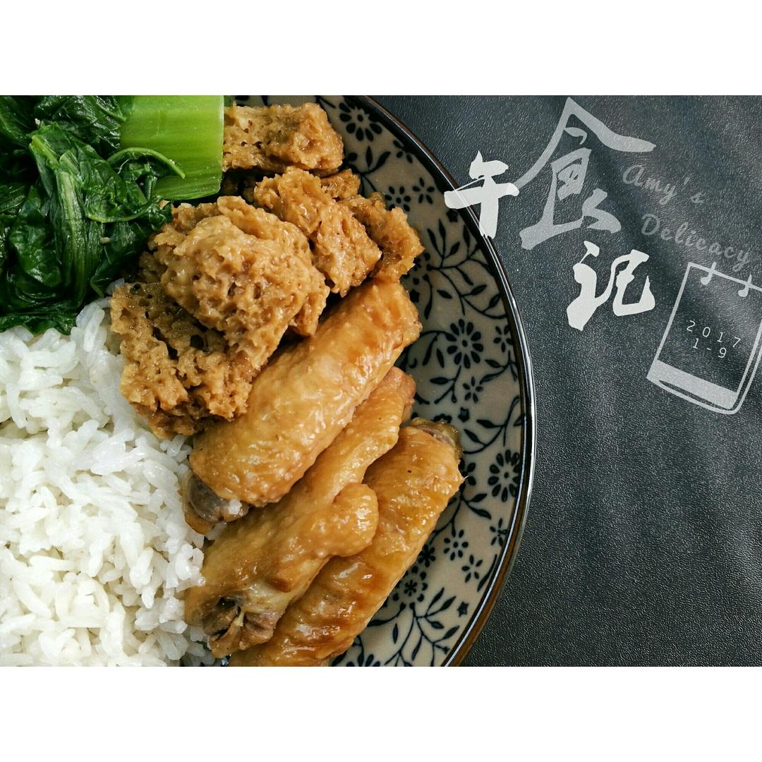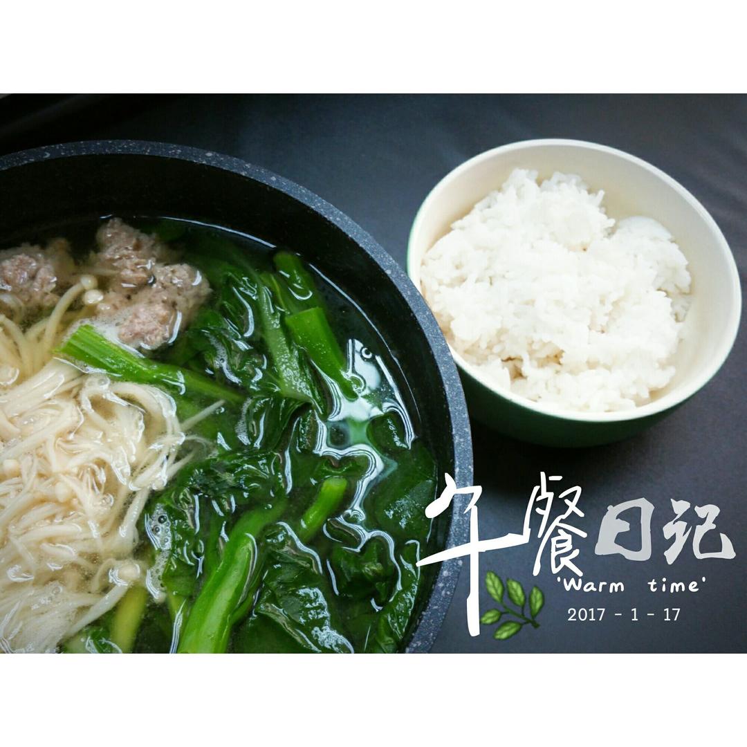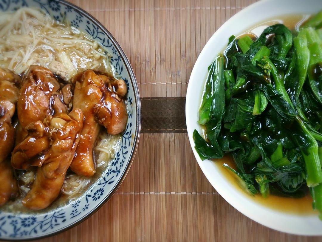 简单快手,糖醋鸡翅蚝油金针菇垫底。节瓜牛肉丸汤,灼了个菜心。