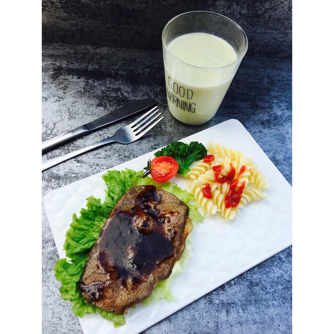 早餐:煎黑胡椒牛排➕番茄螺旋意面➕🍌香蕉牛油果奶昔