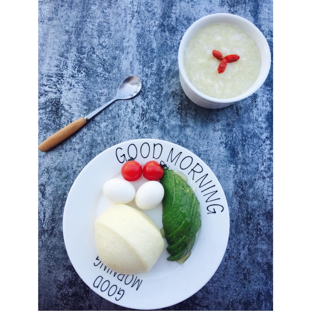 早餐:小米粥➕牛奶馒头➕水煮鸽蛋➕蜂蜜牛油果