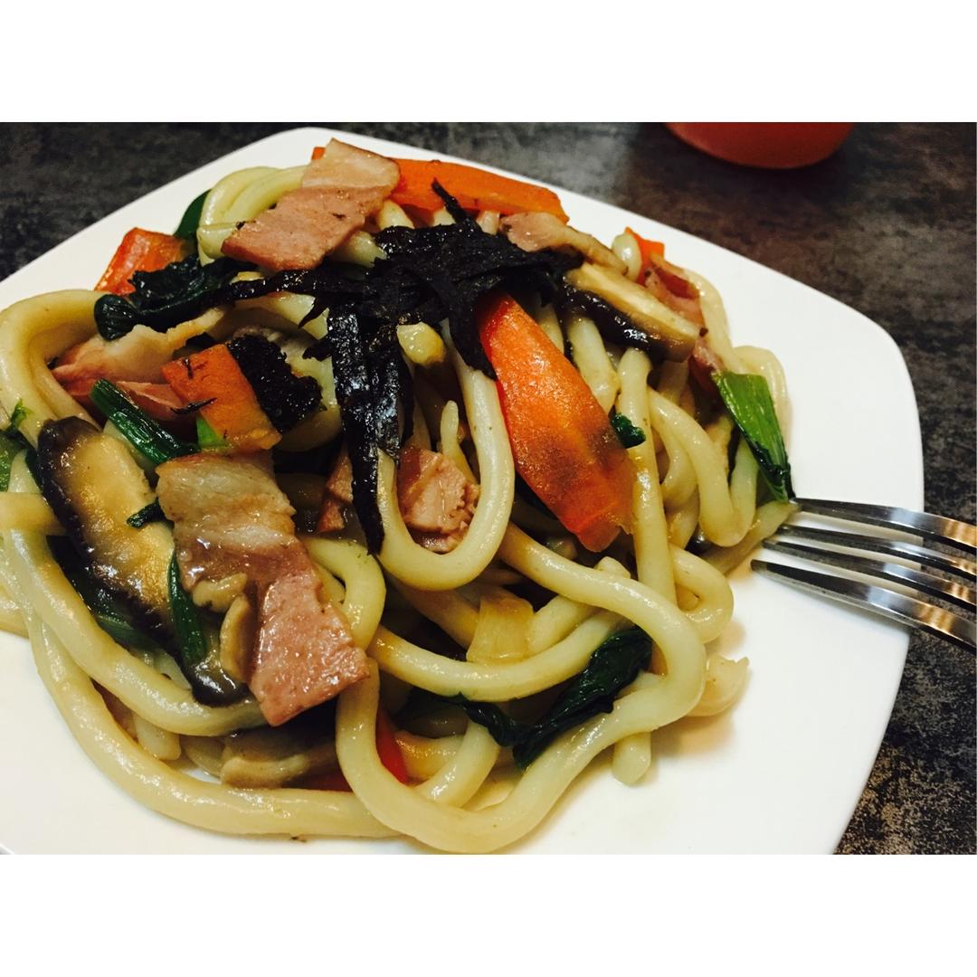 早餐:培根碎炒乌冬面➕胡萝卜苹果汁