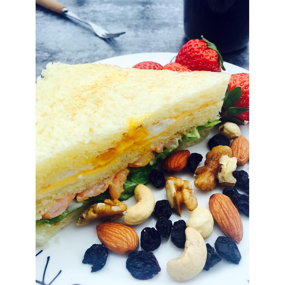 早餐:鲜虾鸡蛋三明治➕草莓🍓➕坚果🌰➕黑豆黑米米糊