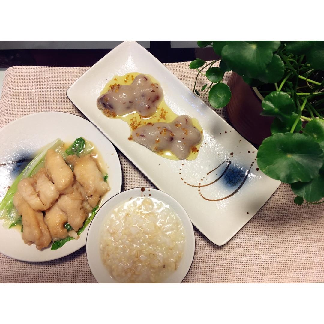 蜜豆桂花年糕、燕麦粥、龙利鱼排
