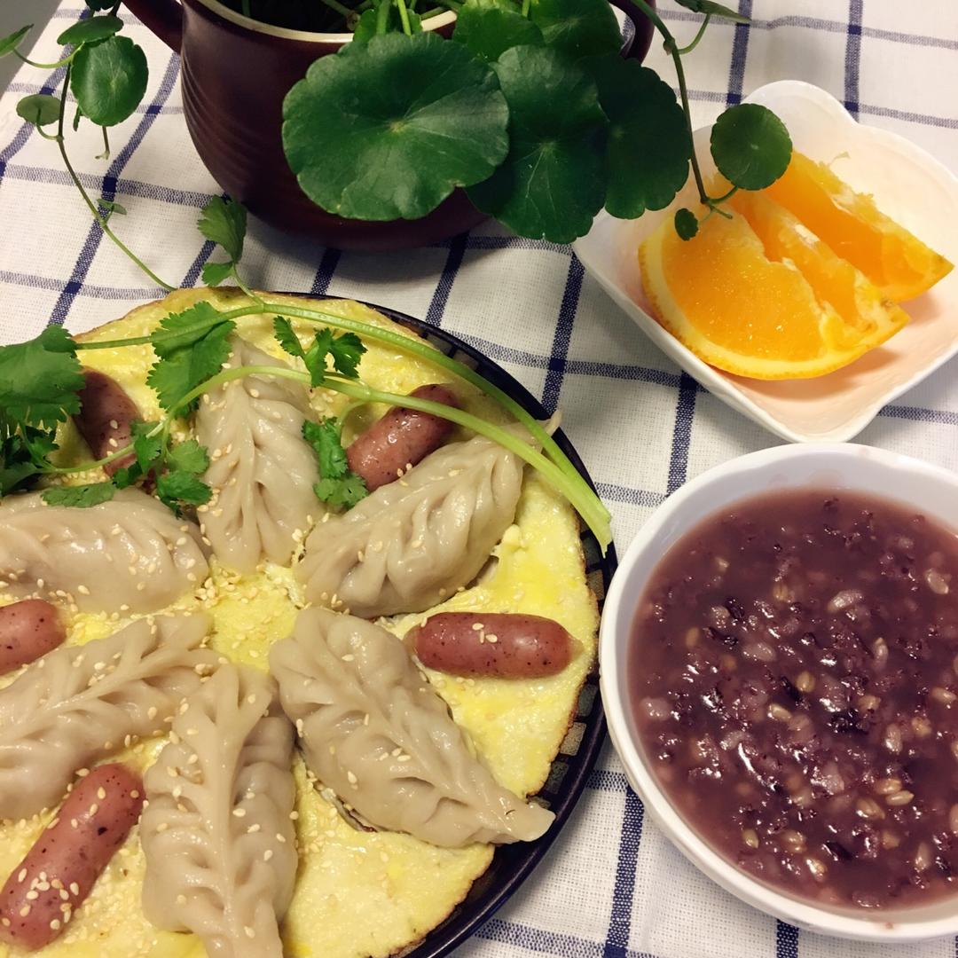 抱蛋煎饺、红米杂粮粥、橙子
