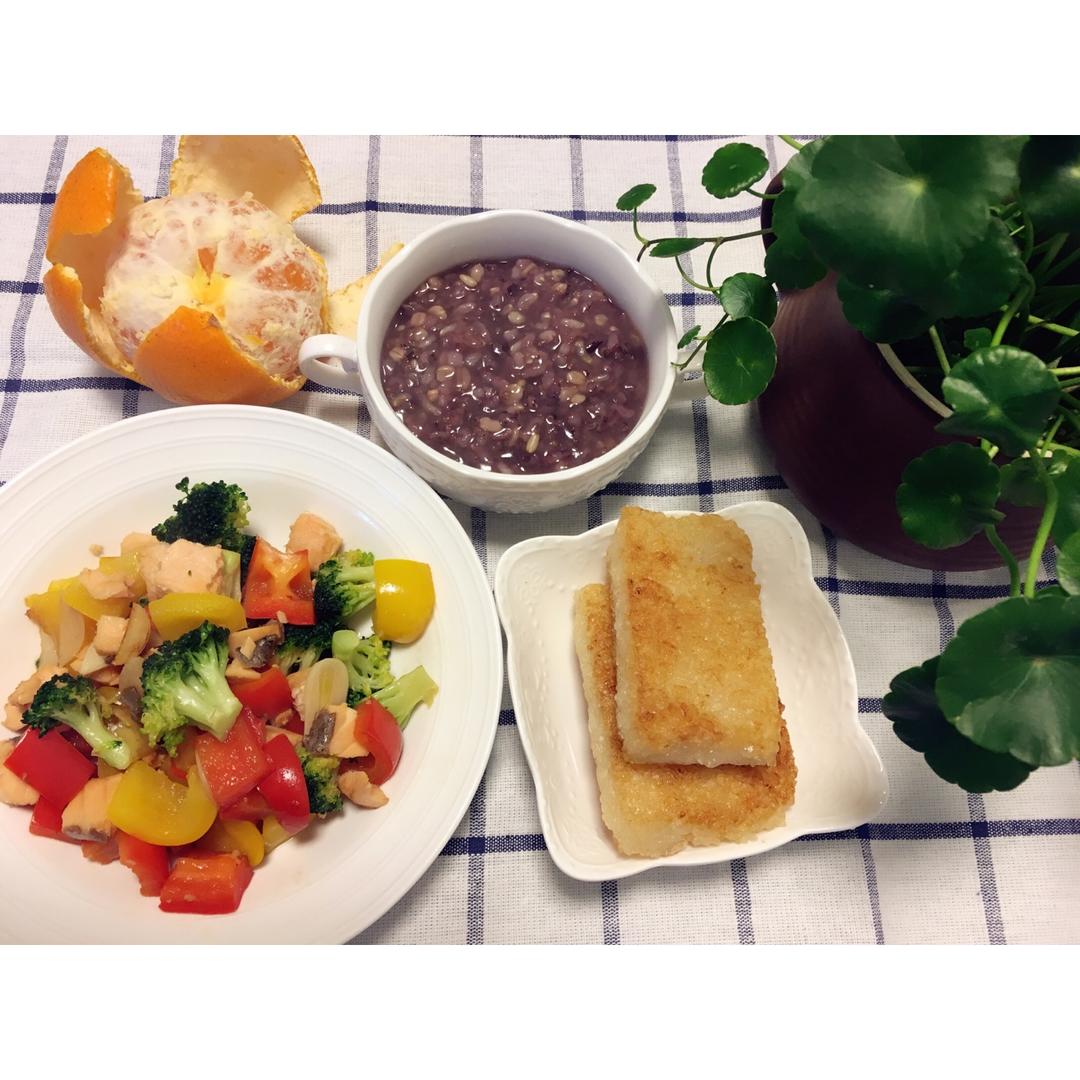 香煎糍粑、红米杂粮粥、时蔬炒西兰花
