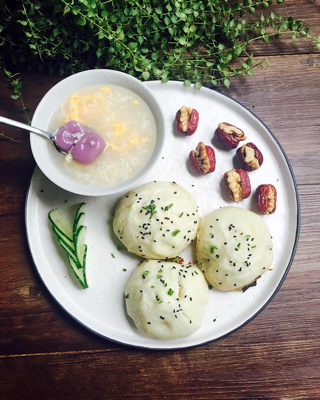 大冬天的广州阴冷潮湿,煮一碗酒酿鸡蛋芋圆汤暖暖心,丑丑的肉包煎的香脆,来几颗红枣核桃补补脑,早餐早安🍴☕️ #早餐•20...
