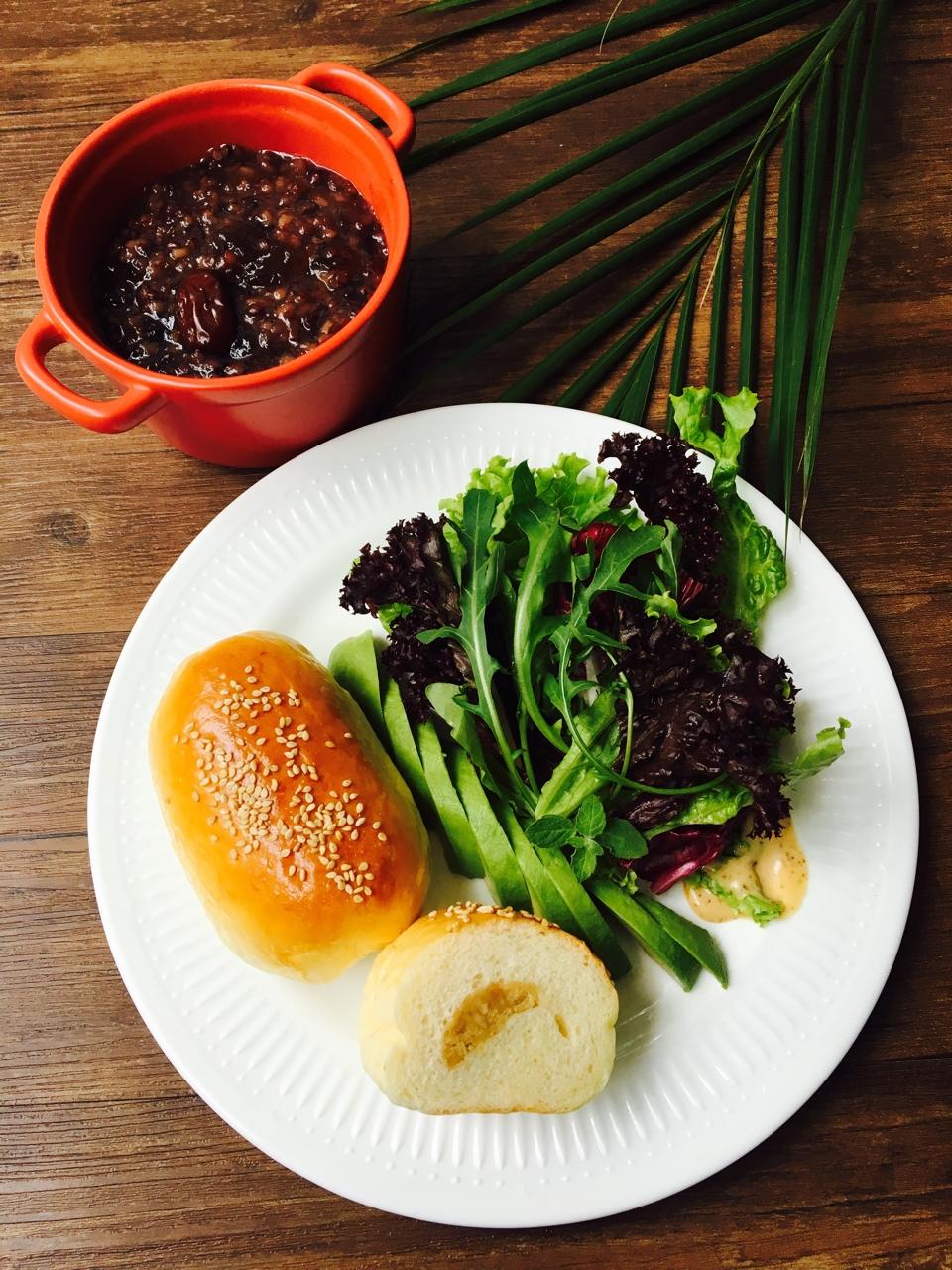 新周愉快💕肉松牛奶包与黑米桃胶粥♨️拌一份芝麻杂菜享用一下🍃我爱早餐🍴😋