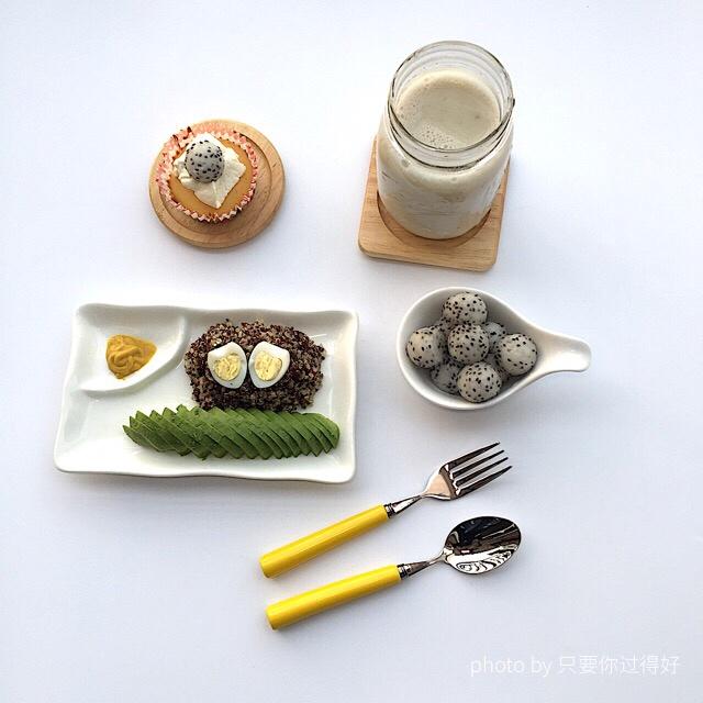 今日爱心❤️早餐:山药芡实豆浆&水果奶油蛋糕&鹌鹑蛋牛油果藜麦饭&炖火龙果球!