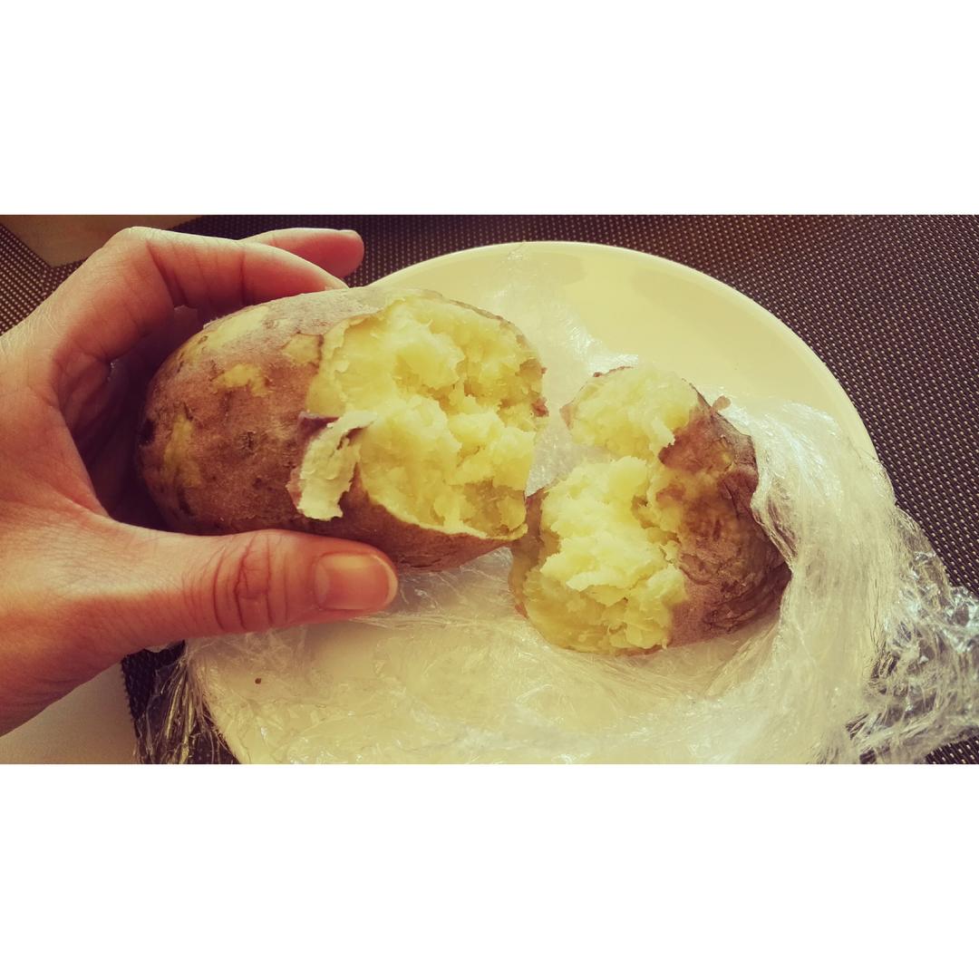 把红薯洗干净,用保鲜膜包几层,微波炉只要4分钟就蒸熟地瓜了!好粉好甜好香!
