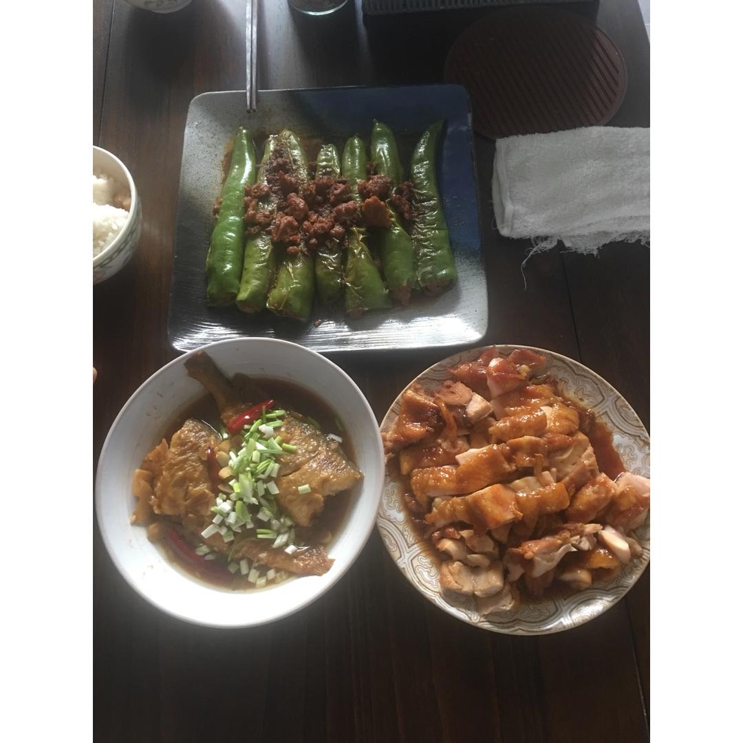 简单的午饭,青椒酿,红烧黄花鱼,照烧鸡腿🍗😋