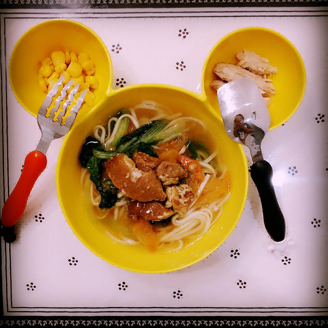 宝贝的番茄牛肉面,搭配玉米和金枪鱼