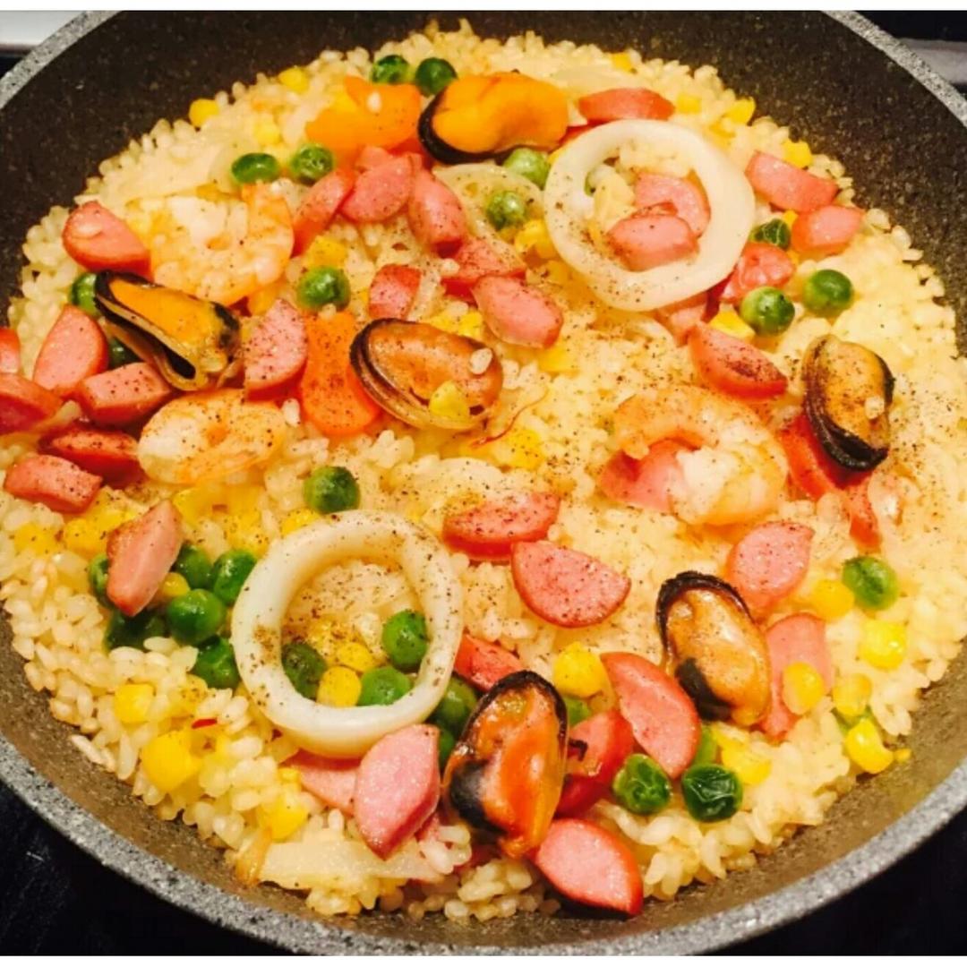 海鲜烩饭搭配香煎鳕鱼