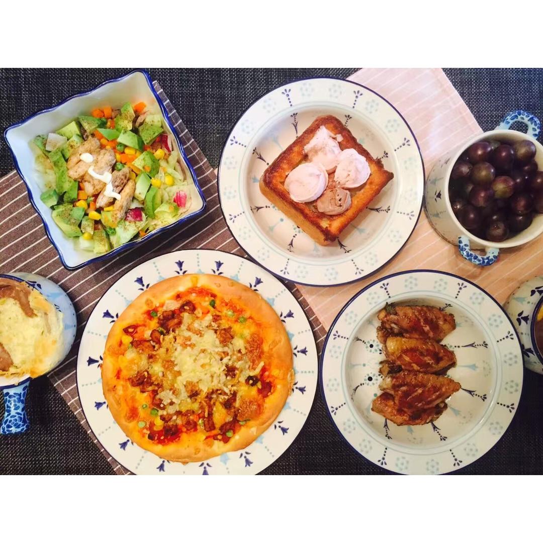周末好幸福💕💕💕鸡肉披萨➕香煎鸡翅➕鸡胸牛油果沙拉➕面包诱惑➕酥皮汤➕葡萄🍇~好饭不怕晚~完美~biubiubiu~ #...