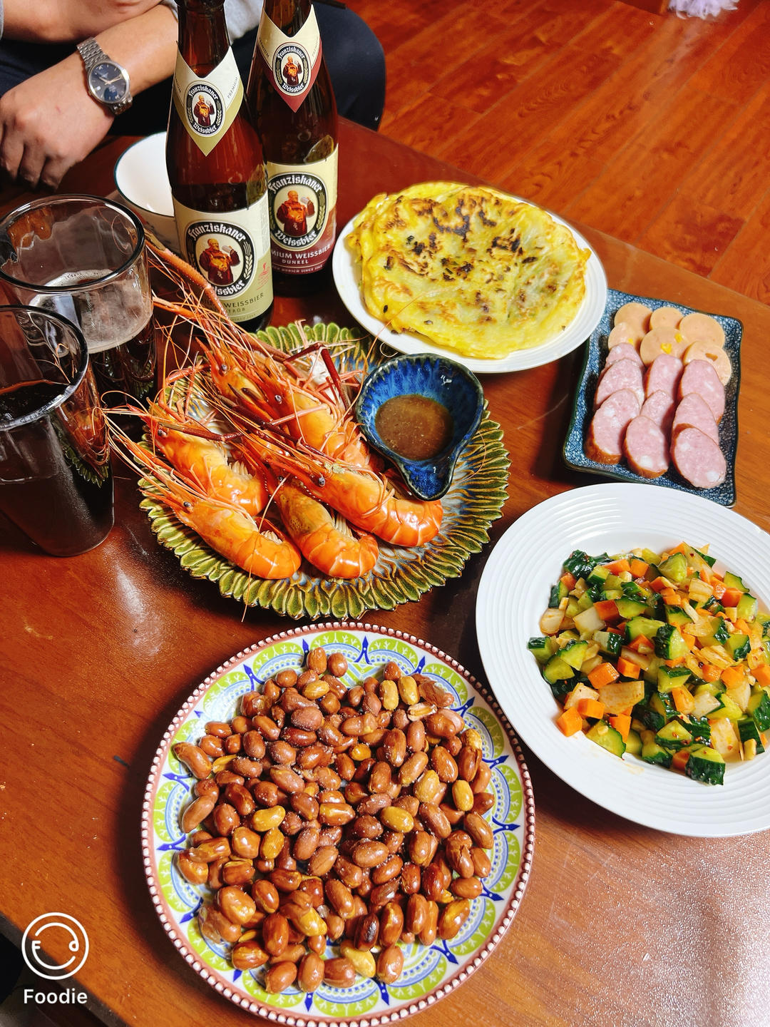 二人小酌,牛肉蒜苗锅出溜、罗氏🦐拌三丁花生和红肠。圣诞快乐🧑🎄