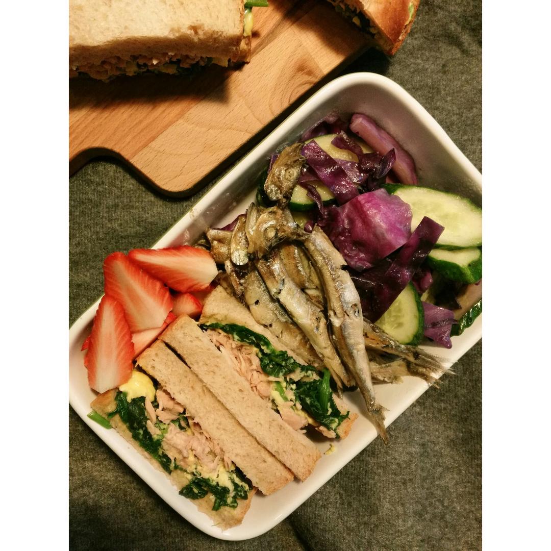 做了全麦吐司,用来做了菠菜鸡蛋吞拿鱼三明治~多春鱼~蔬菜做了青瓜和紫椰菜...