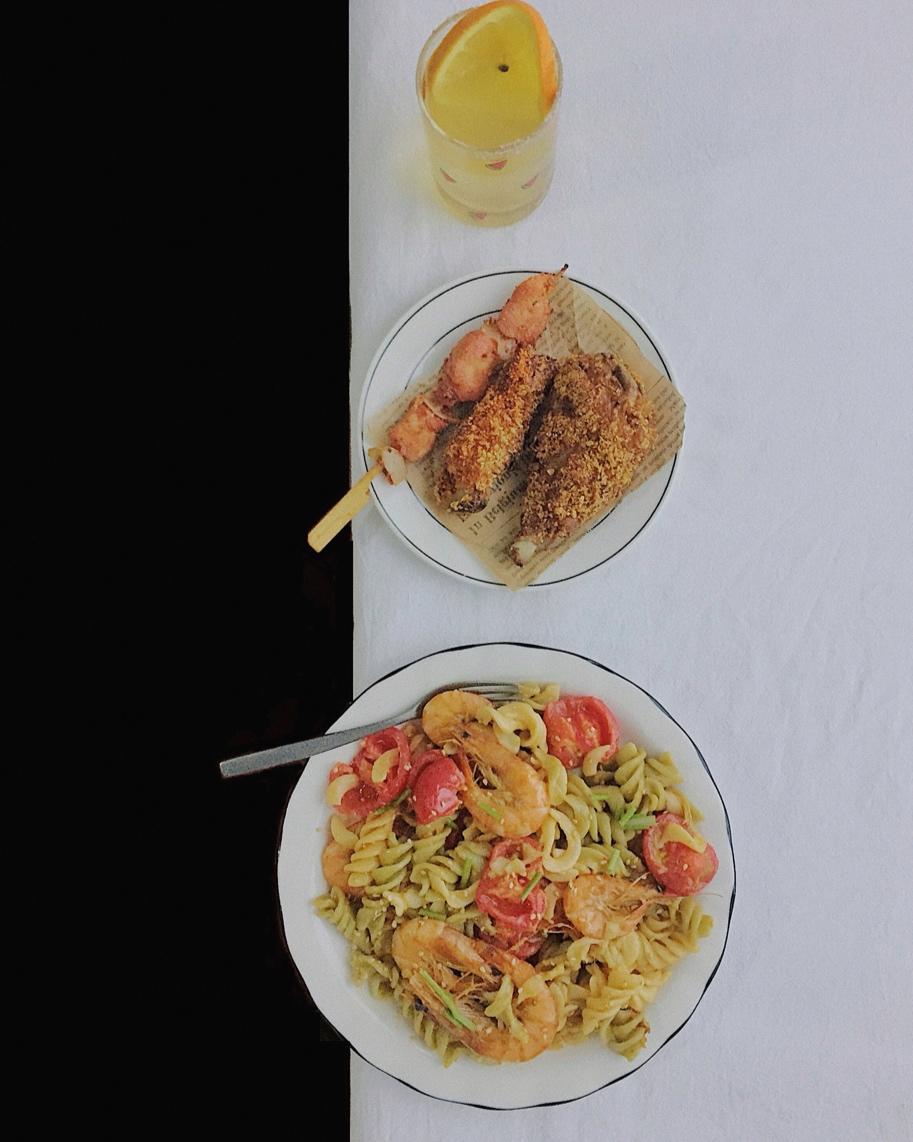 早餐:鲜虾牛奶意面、百香果橘子水