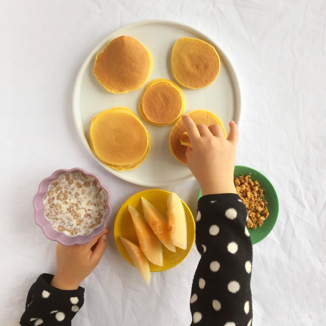 早餐:松饼、牛奶麦片、小香瓜、猪肉松。