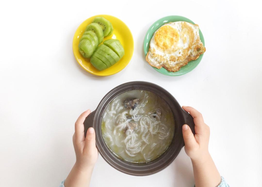 ✦ 早餐:砂锅鸡汤米线、煎蛋、七不够猕猴桃