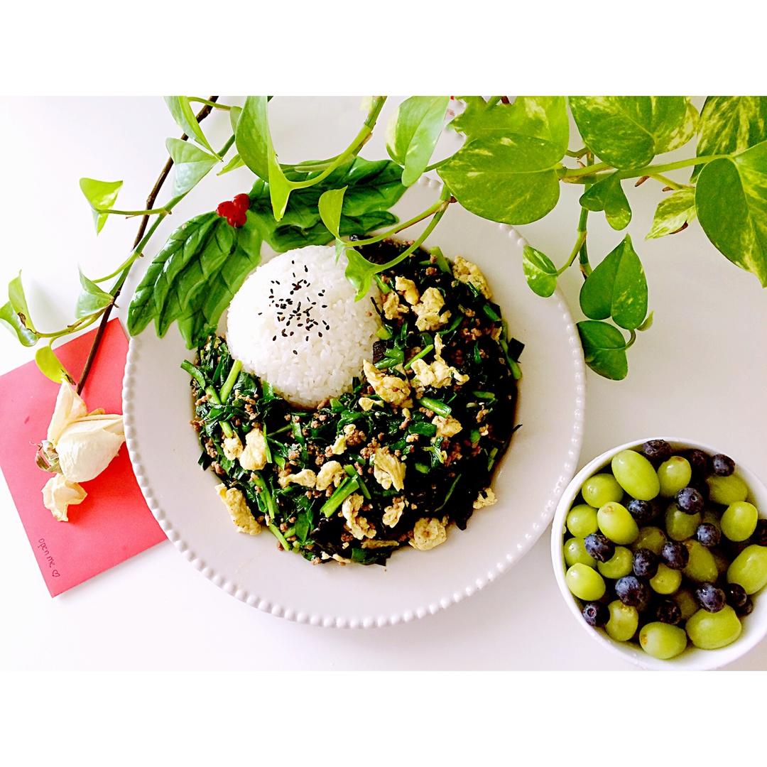 韭菜肉末木耳炒鸡蛋。属于春天的韭菜都上市了,不知为什么今天下起了鹅毛大雪😢春天在哪里?