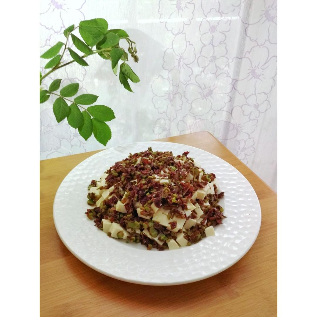 香椿芽拌豆腐。不需要太多佐料,就几颗盐几颗味精,嚼一口...