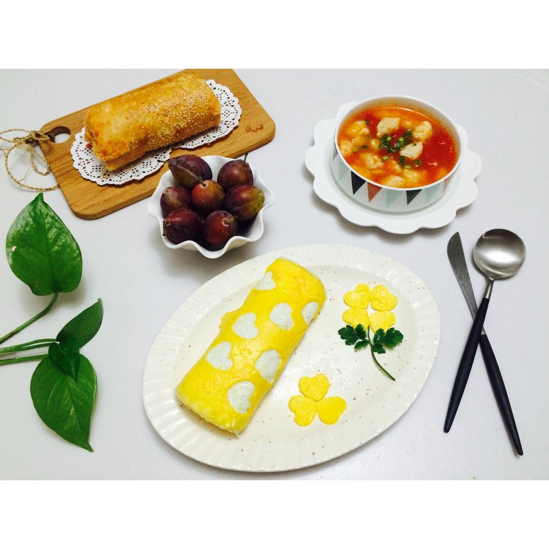 心形蛋包饭+番茄尤利鱼汤+肉松蛋糕卷+澳洲西梅