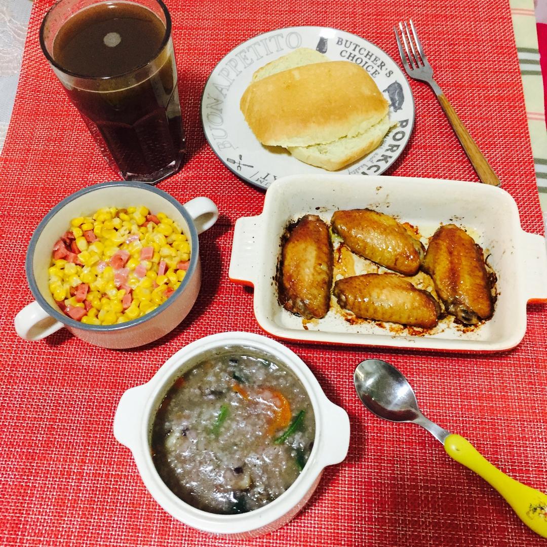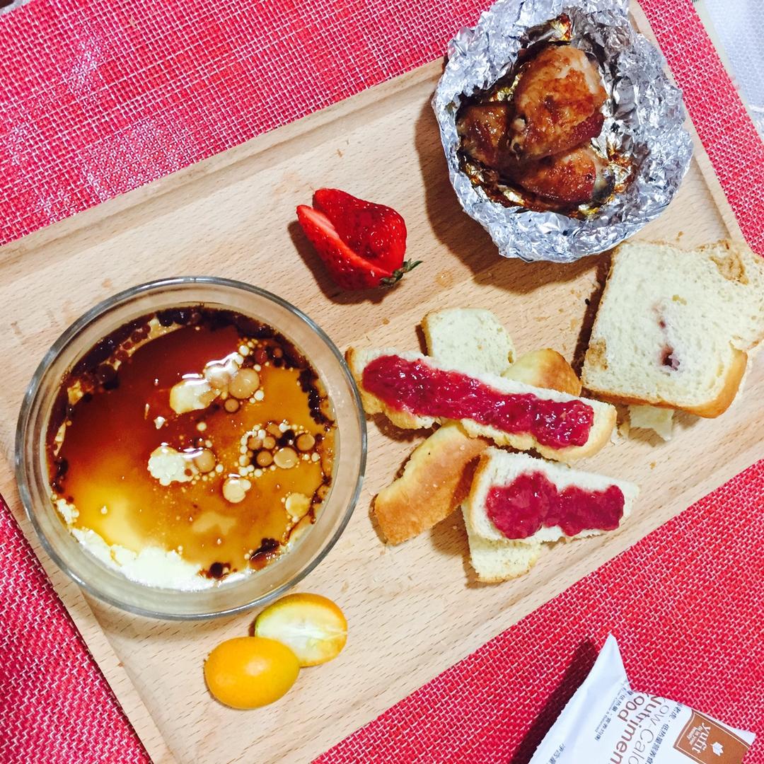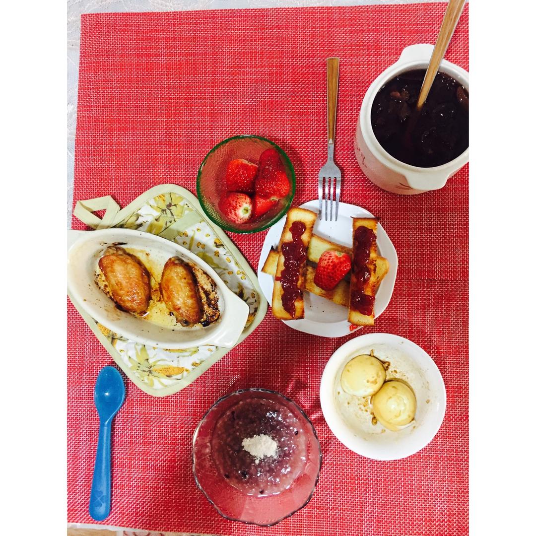 少爷:烤鸡翅、酱油鸡蛋、红米小米大米粥(加了虾粉)吐司条配自制草莓酱;