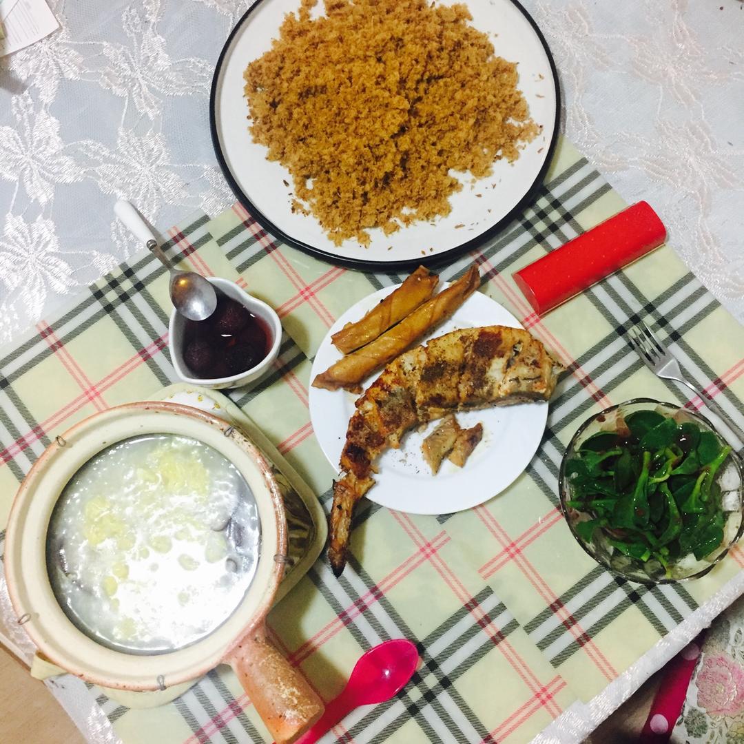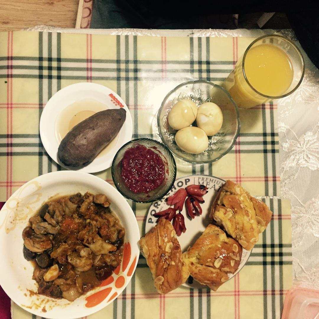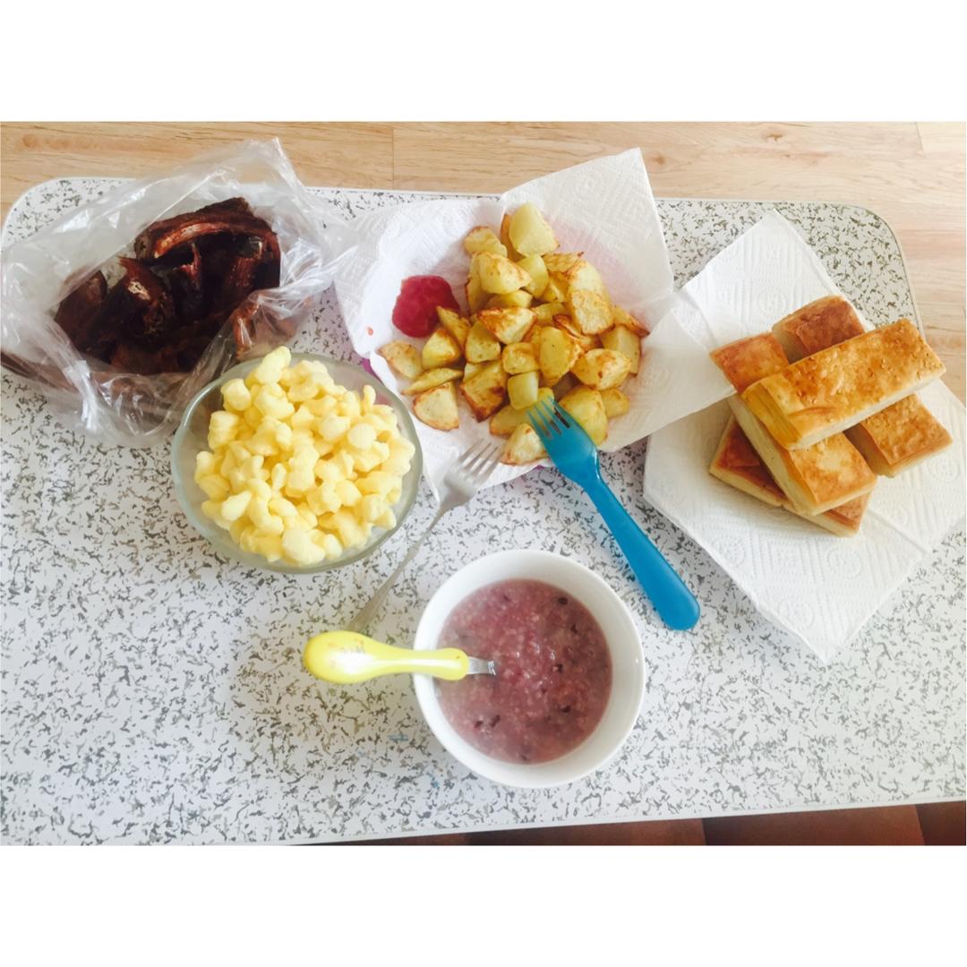 少爷:烤鸡翅、酱油鸡蛋、红米小米大米粥(加了虾粉)吐司条配自制草莓酱;
