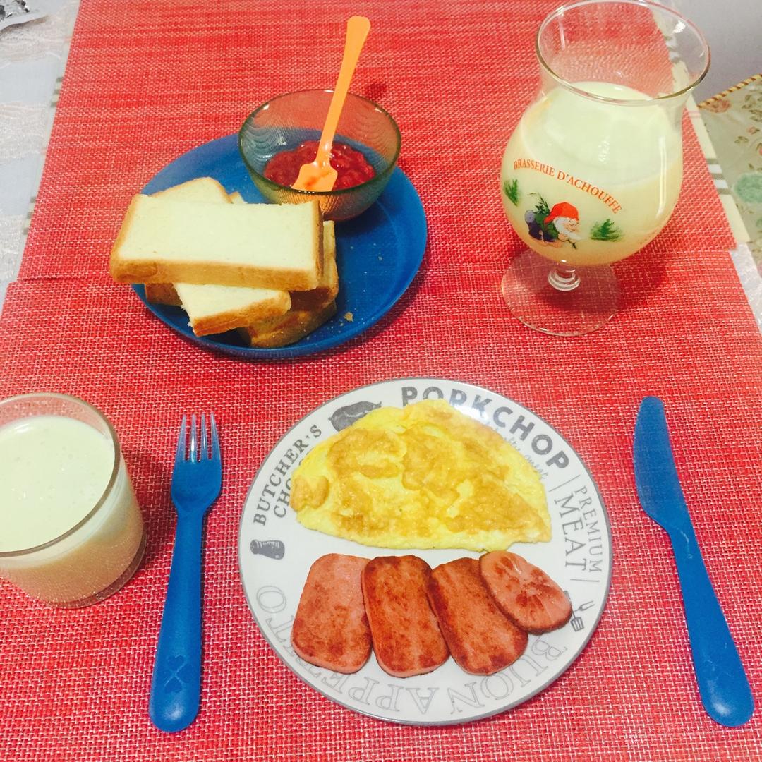 少爷:美式早餐火腿煎蛋饼、地瓜奶昔、烤吐司、草莓酱