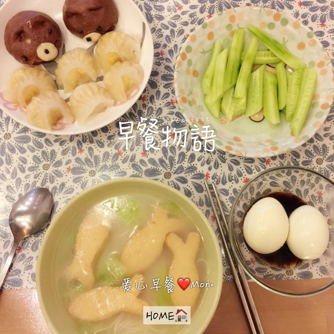 小鱼豆腐面汤🍜虾饺🍤豆沙小熊🐻鸡蛋🥚黄瓜条🥒