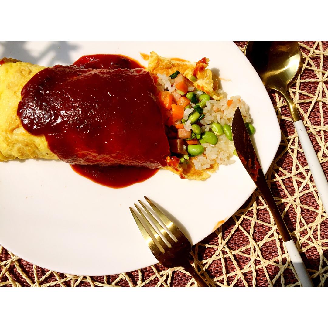 蛋包饭,炒饭加入胡萝卜、青豆、午餐肉,2个蛋煎成鸡蛋饼,用蛋饼包上炒好的饭,淋面是蚝油+番茄酱炒一下,春天就酱样子吃。 ...