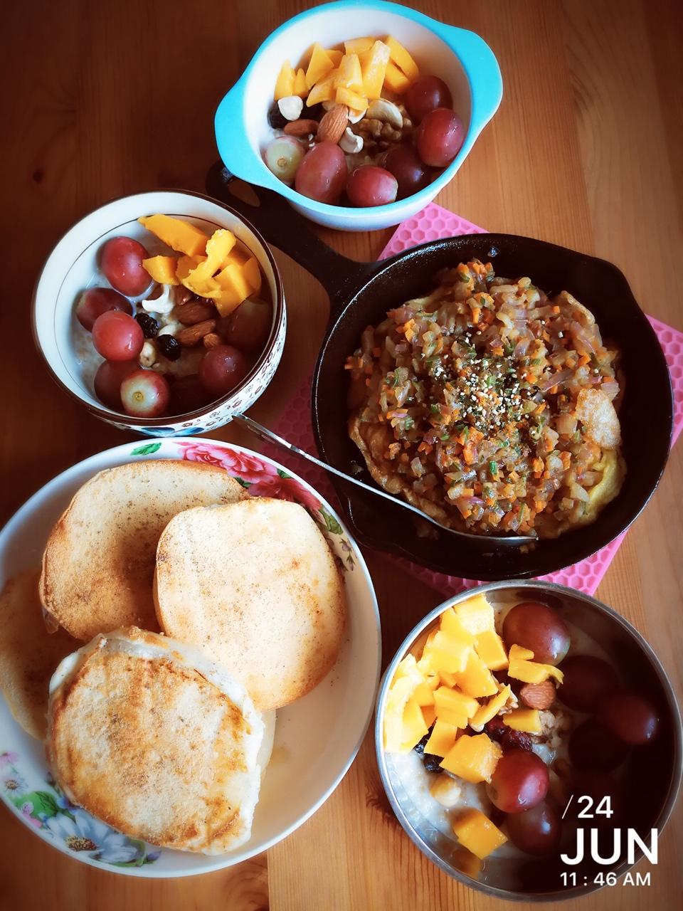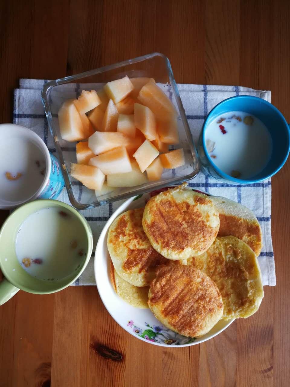 早饭:坚果牛奶+蛋煎馍片+蜜瓜