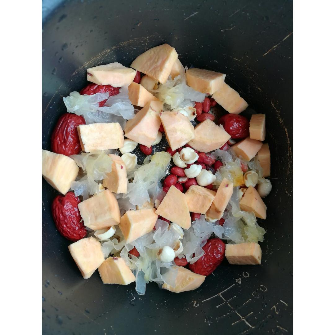 银耳与莲子一直很配,但似乎可以加点红枣红薯点缀